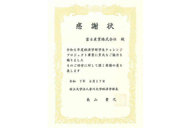 香川大学経済学部長様より感謝状地元の企業として、香川大学の皆さんの応援をしていきたいと思います。
